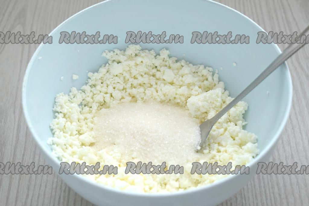 К смеси творога и сахара вбиваем сырое яйцо, хорошо перемешиваем творожную массу.