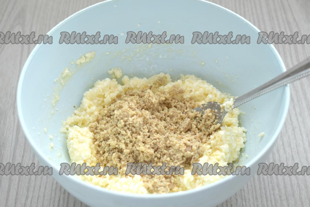 Измельчённые орехи перекладываем в творожную массу, перемешиваем.