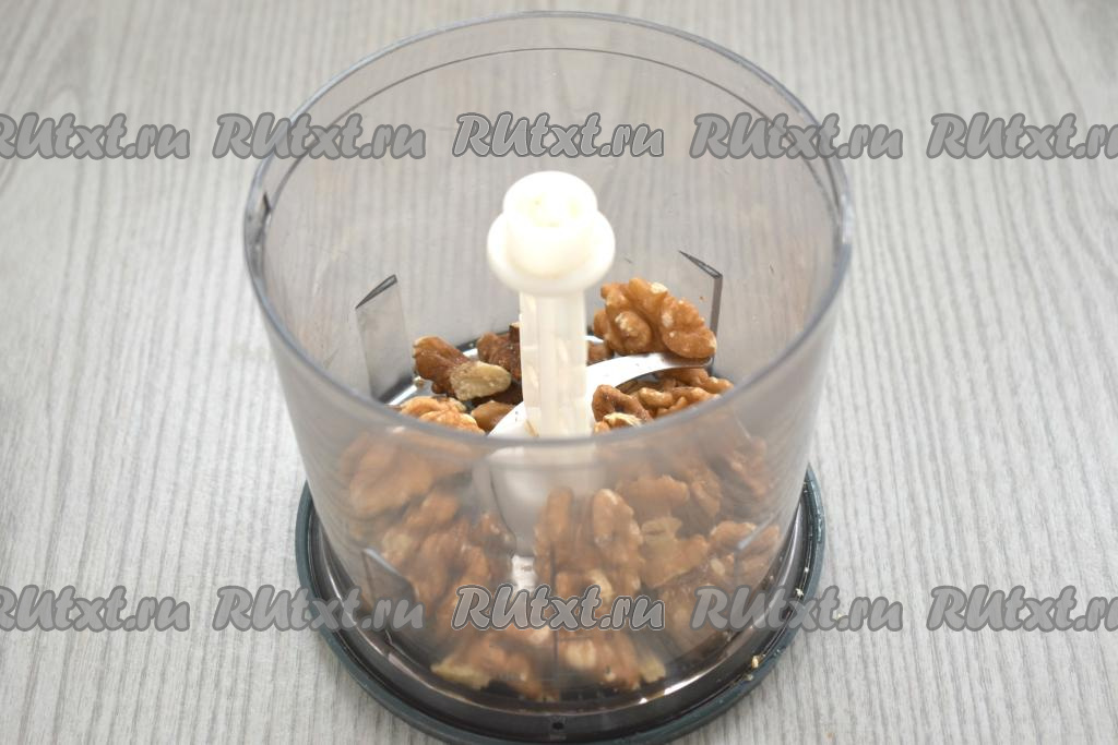 Очищенные орехи (у меня - грецкие) можно немного подсушить, для этого их нужно выложить на сухую разогретую сковороду и на среднем огне, помешивая, обжарить в течение 3-5 минут. Затем убрать с огня, дать остыть. Орехи перекладываем в чашу измельчителя, измельчаем до получения крошки.