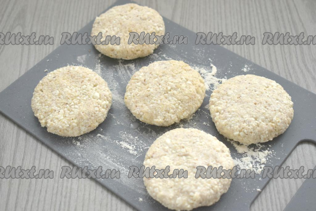 Творожное тесто с орехами делим на 5 кусочков. Из каждого кусочка теста руками, слегка смоченными водой, скатываем лепёшку-сырник. В результате я сформировала 5 сырников.