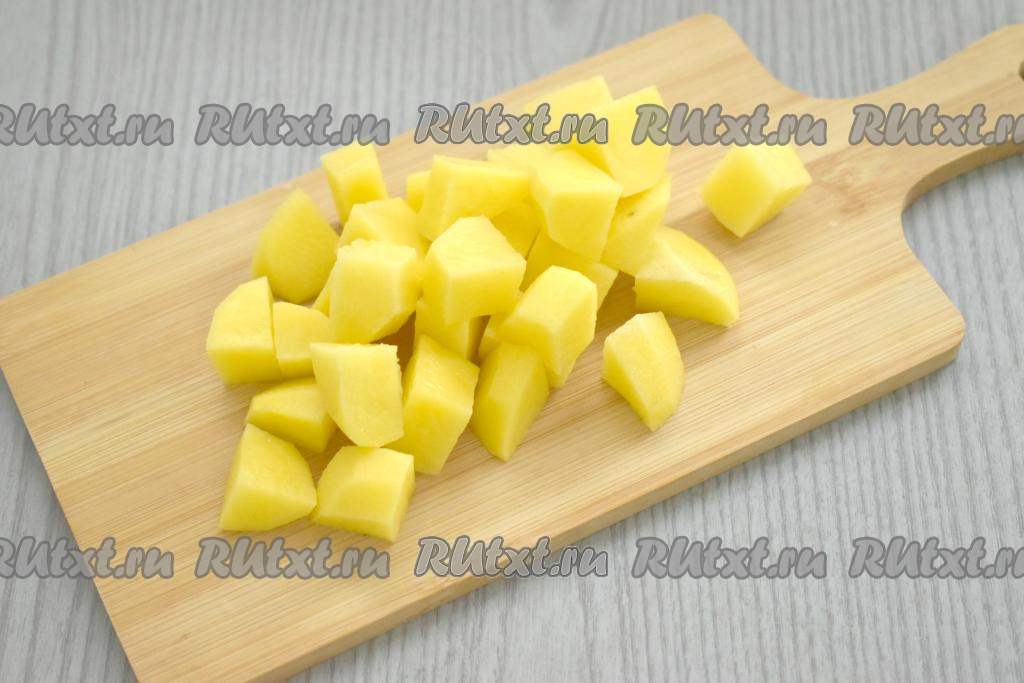 После того как горох сварится до мягкости, добавляем в кастрюлю очищенный картофель, нарезанный на средние кубики. Даём бульону закипеть и варим на небольшом огне 15 минут.