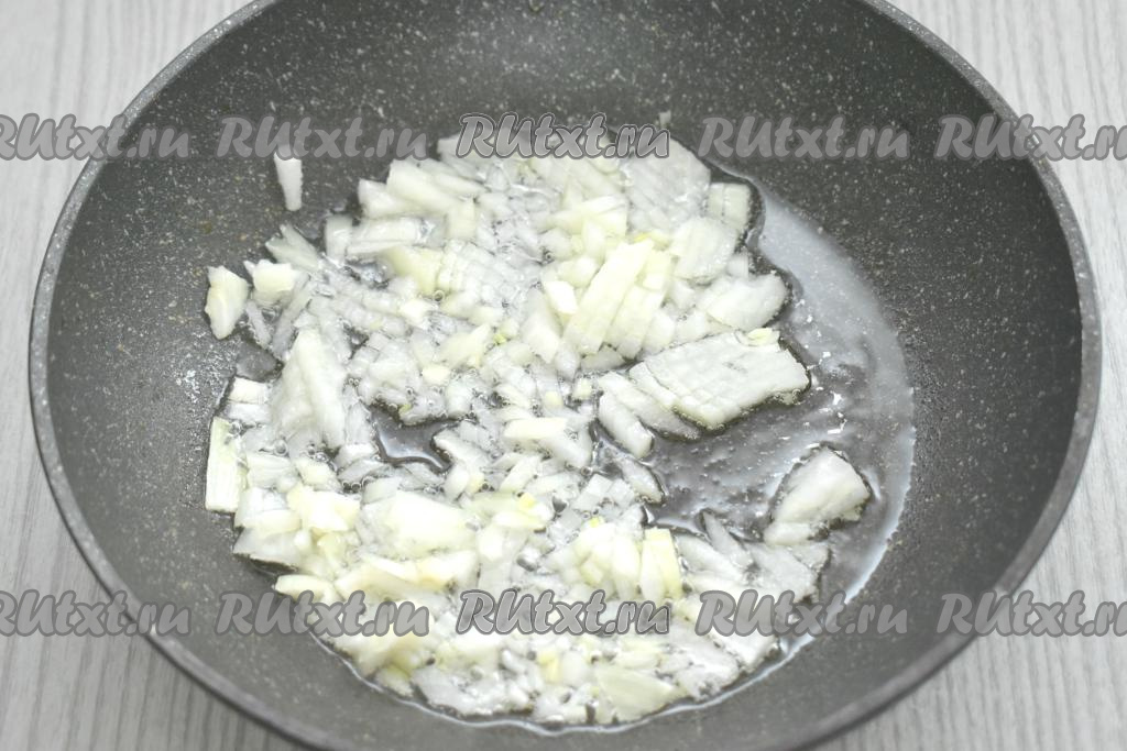 Морковь и лук очищаем. Хорошо разогреваем растительное масло в сковороде, после этого выкладываем достаточно мелко нарезанный лук, обжариваем его на среднем огне минуты 3-4 (до мягкости), периодически перемешивая.
