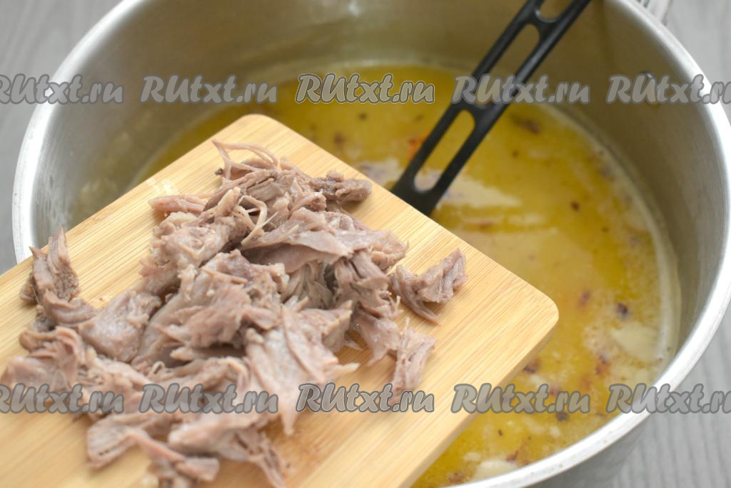 После того как картошка проварится 15 минут, выкладываем в кастрюлю с гороховым супом обжаренные овощи. Сразу же добавляем варёное мясо утки, снятое с кости, перемешиваем. Доводим гороховый суп до кипения и варим на небольшом огне 5-7 минут.