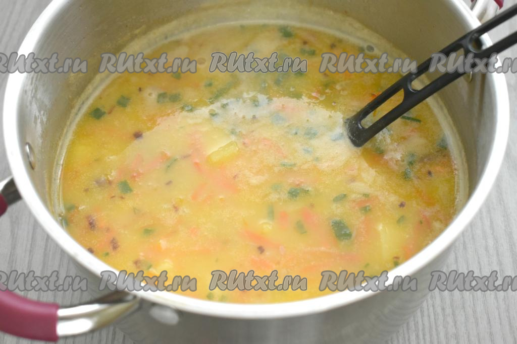 Затем пробуем суп на вкус, если нужно, досаливаем. Перчим. При желании добавляем нарезанную зелень (у меня - замороженный зелёный лук). Перемешиваем, даём закипеть, провариваем 1-2 минуты на небольшом огне и убираем с огня.