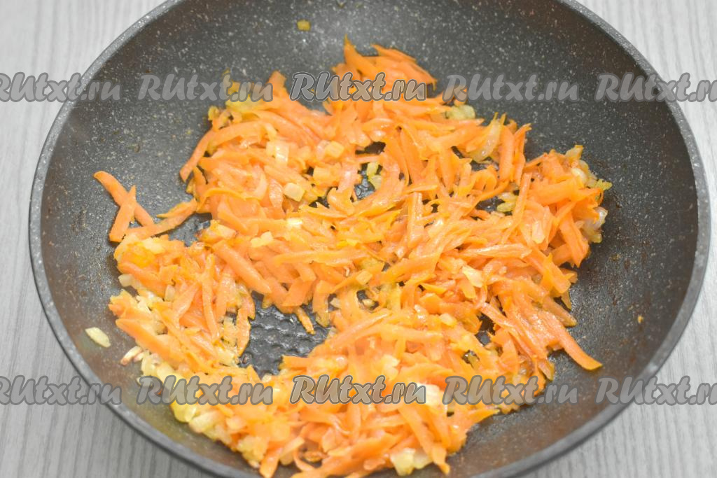 К обжаренному луку выкладываем натёртую на крупной тёрке морковку, перемешиваем овощи и обжариваем минут 5-6 (до мягкости моркови), не забывая иногда помешивать. Убираем обжаренные овощи с огня.