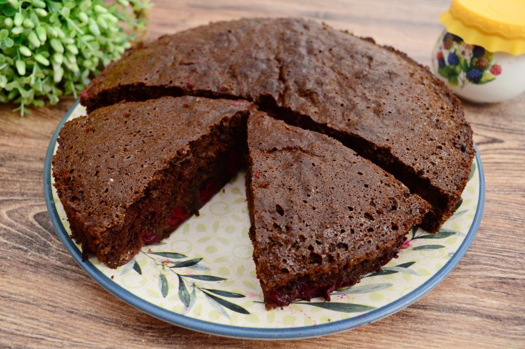Переложить остывший шоколадно-вишнёвый пирог на плоскую тарелку.