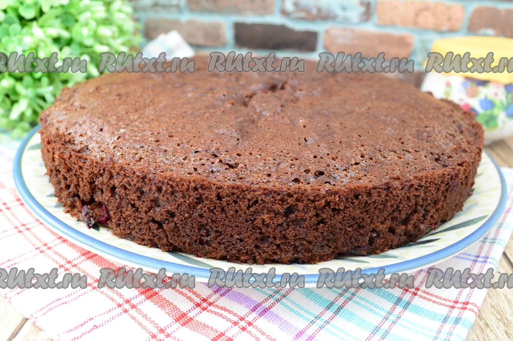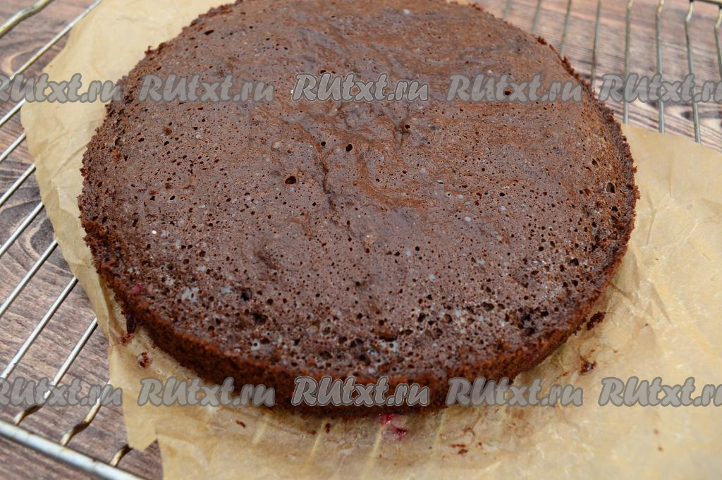 Шоколадный пирог с вишней поставить выпекаться в разогретую до 180 градусов духовку на 40-45 минут. Готовность выпечки можно проверить, проколов сверху сухой деревянной зубочисткой. Если зубочистка останется сухой после прокалывания, значит бисквит готов. Вынуть форму с готовым бисквитным пирогом из духовки. Оставить остывать минут на 5, затем вынуть пирог из формы, переложить на решётку и оставить его до полного остывания.
