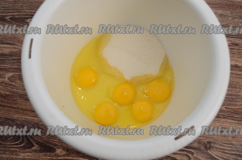 В чашу миксера вбить сырые яйца, всыпать сахар, взбить на максимальной скорости миксера в течение 6-7 минут. Яичная масса в процессе взбивания должна увеличиться в объёме и посветлеть.