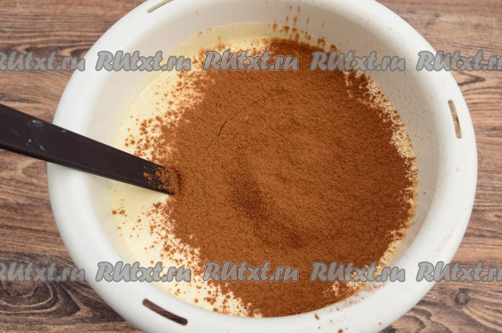 В получившуюся смесь яиц и кефира просеять какао.
