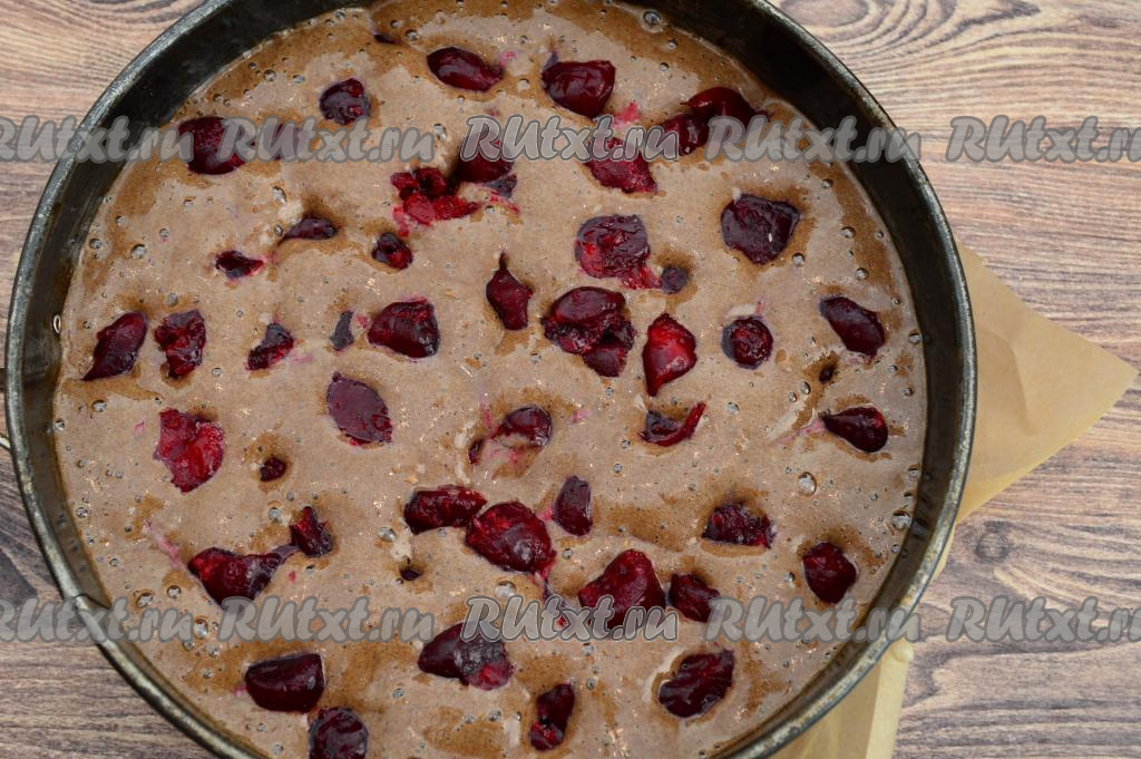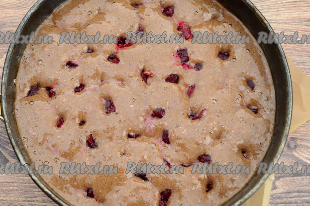 Дно разъёмной формы для выпечки диаметром 23 сантиметра застелить пергаментом. Растительным маслом смазать бока формы для выпечки и пергамент, застилающий дно формы. Вылить шоколадное тесто в форму. Поверх теста равномерно распределить вишню.