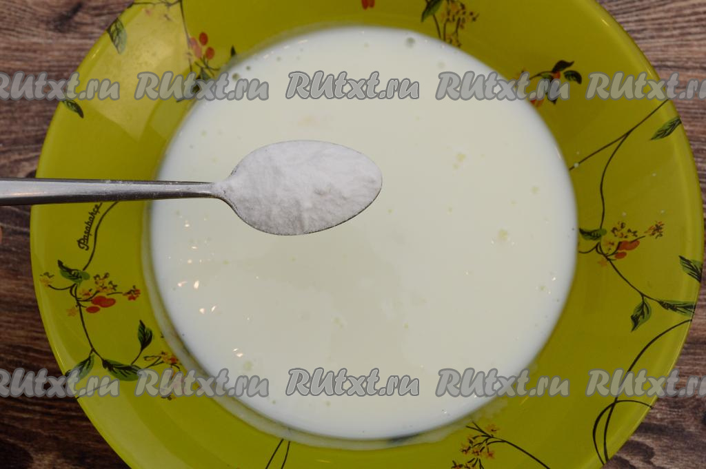 Пока взбиваются яйца, нужно в глубокую тарелку влить кефир. Желательно, чтобы кефир был комнатной температуры. В кефир всыпать соду, перемешать и оставить на 3-5 минут.