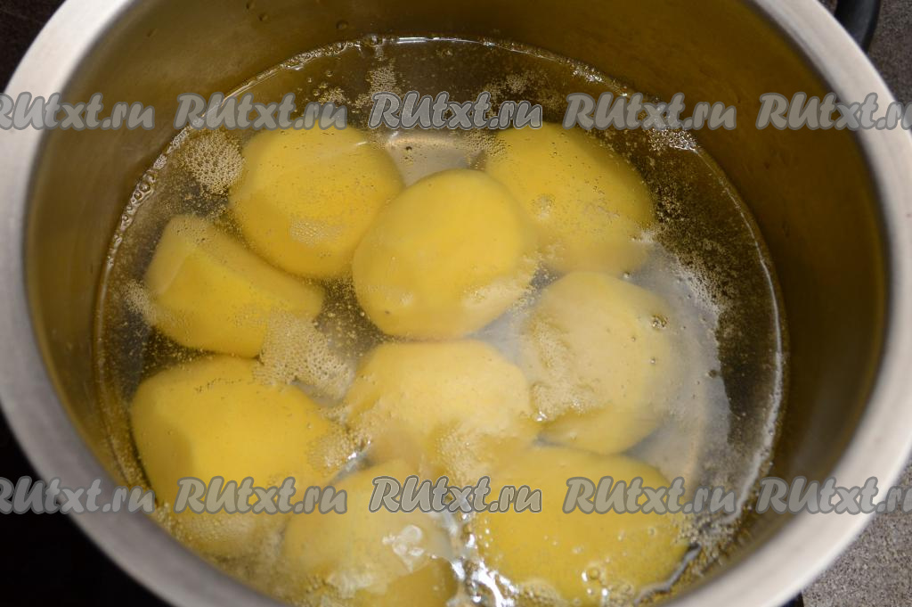 Картофель очистить, выложить в кастрюлю, залить полностью водой и поставить на огонь. После закипания воды отварить картошку на небольшом огне до полуготовности (ориентировочно в течение 10-12 минут, картофель должен хорошо держать форму и при этом уже достаточно легко прокалываться ножом).