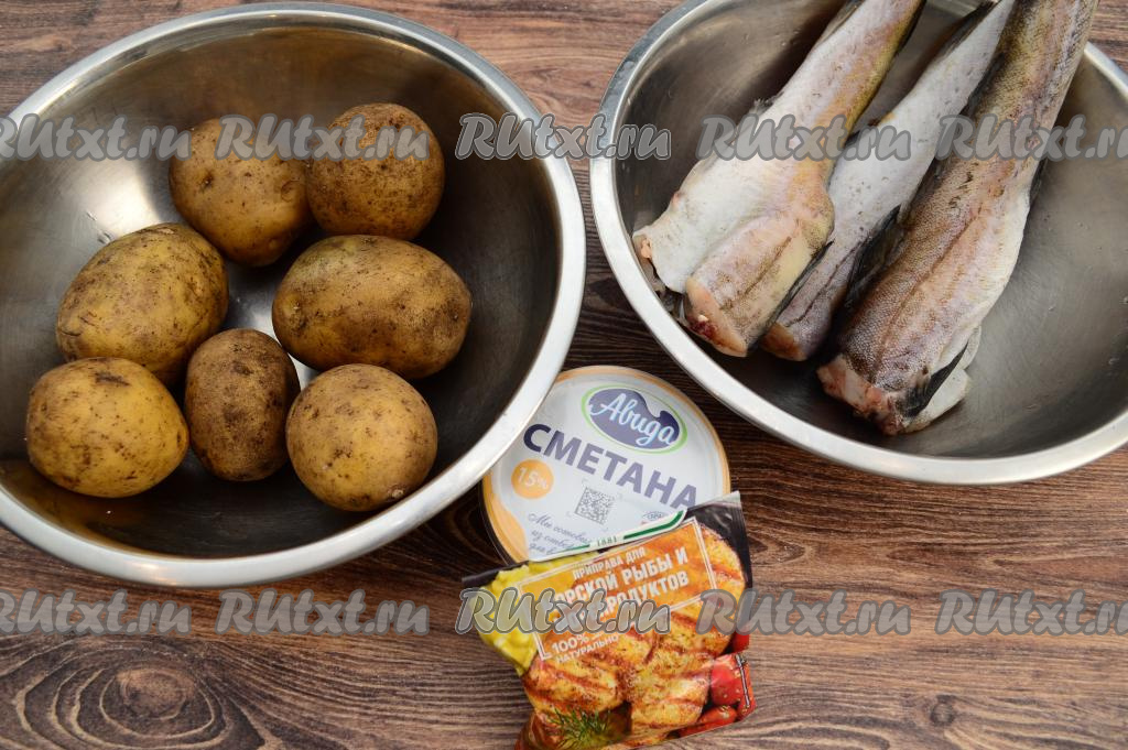 Подготовить продукты. Если минтай заморожен, тогда его нужно полностью разморозить. Сметану можно взять любой жирности, я взяла жирностью 15%.