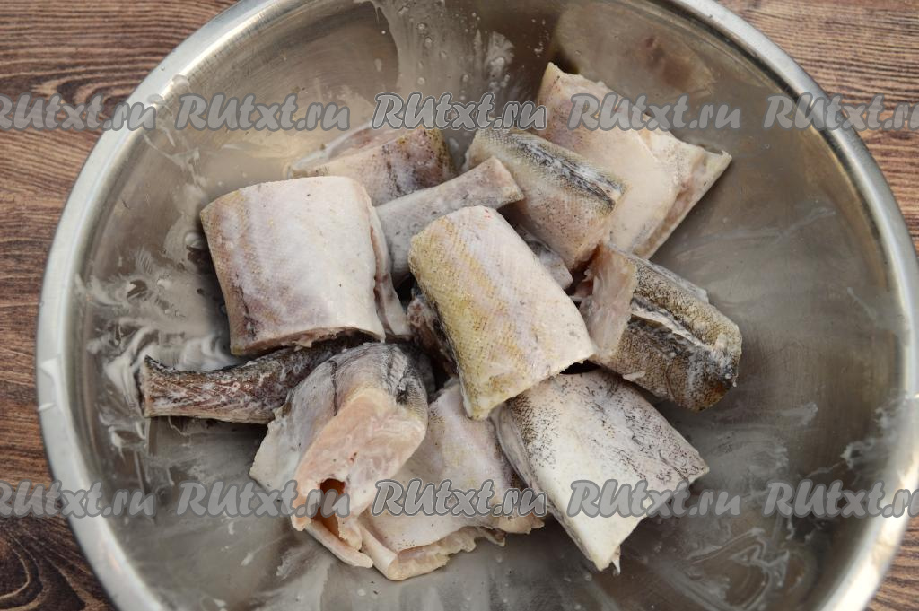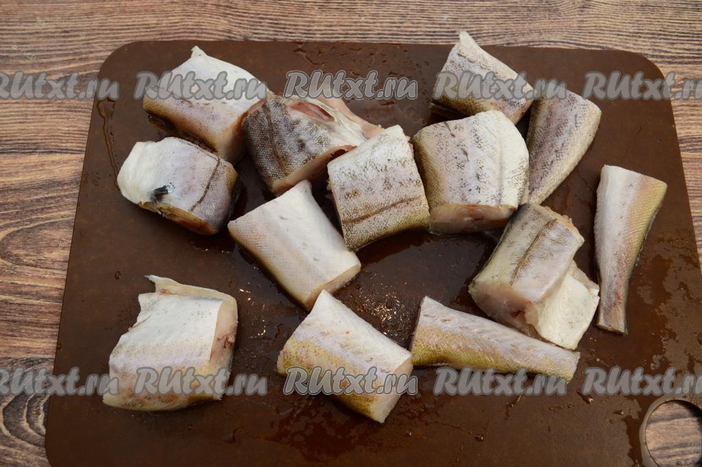 Пока отваривается картошка, подготовить тушки минтая. Разрезать брюшко, удалить внутренности вместе с чёрной плёночкой, хорошо промыть водой. Отрезать все плавники и хвост. Нарезать подготовленного минтая на порционные кусочки.