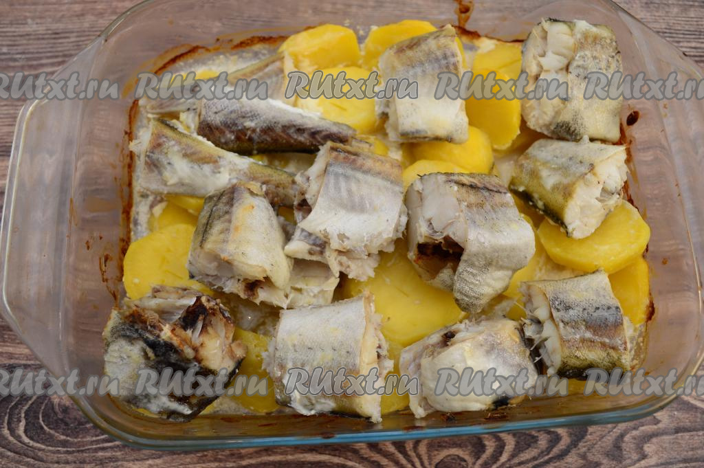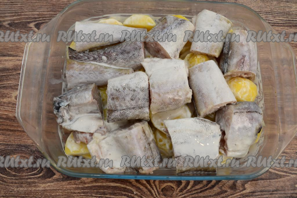 Поверх картошки разложить кусочки минтая. Отправить форму в разогретую до 180 градусов духовку на 30 минут. Затем минтая сверху смазать отложенной сметаной и отправить рыбу с картофелем запекаться в духовку ещё на 20 минут.