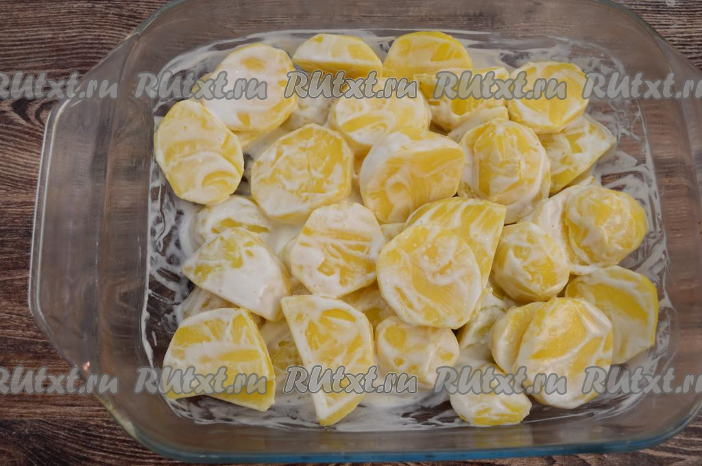 Кусочки картошки сложить в миску, посолить по вкусу. Примерно 2 столовых ложки сметаны отложить. Остальную сметану смешать с картошкой. Выложить картофель ровным слоем в форму для запекания.