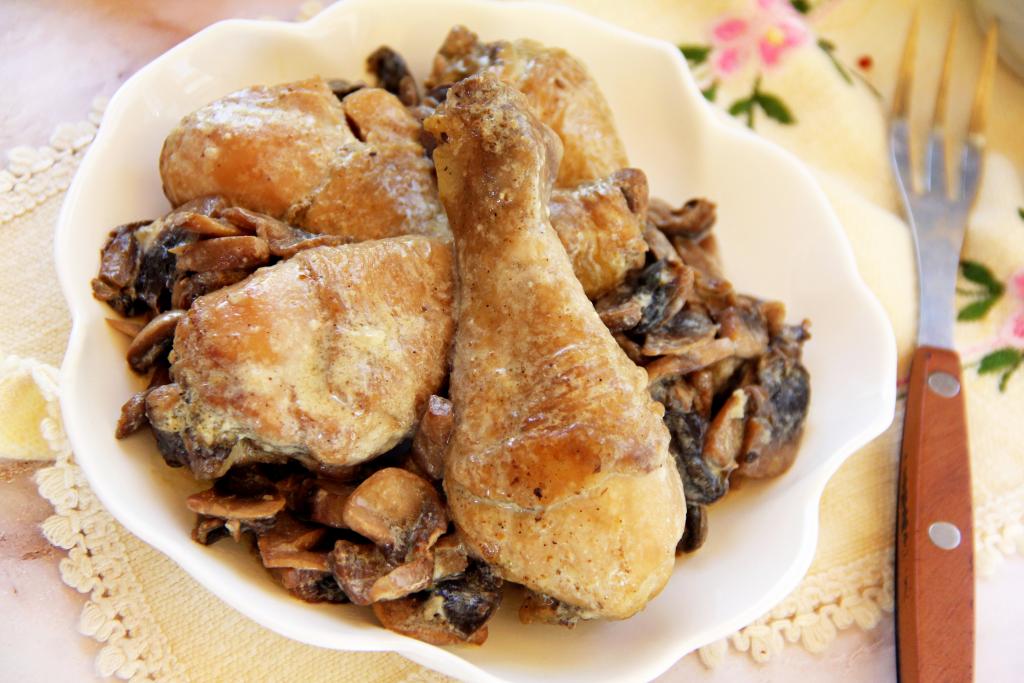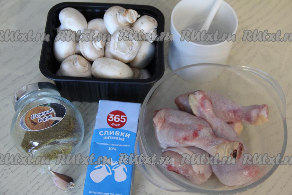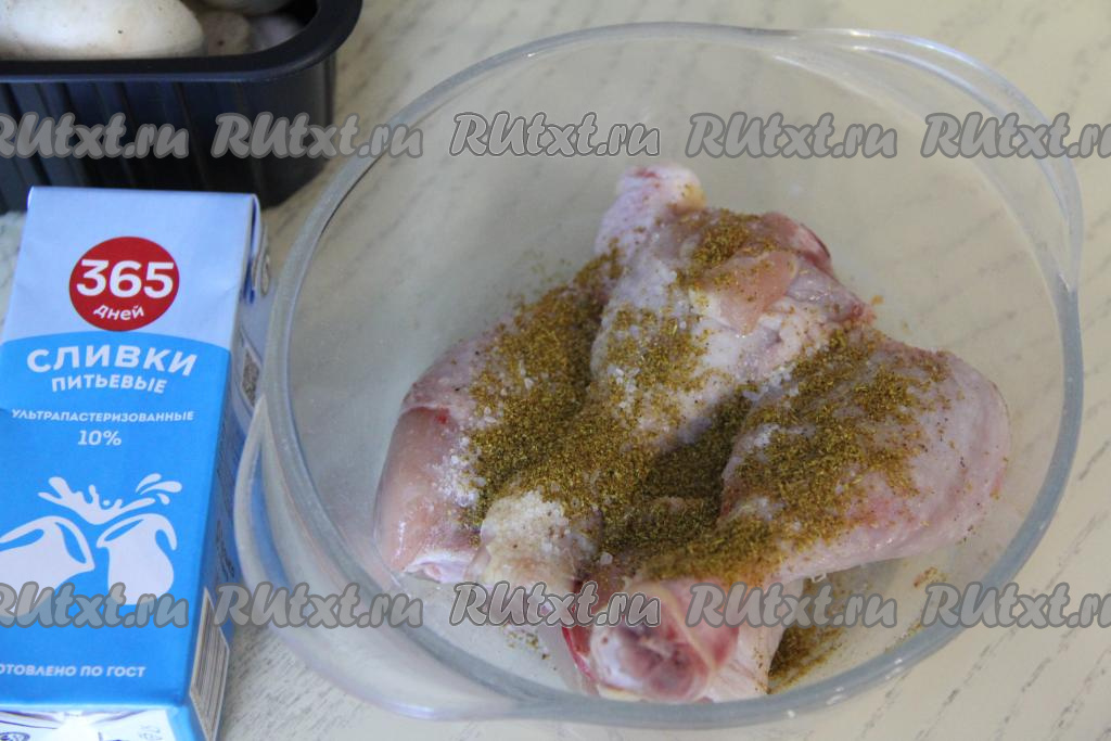 Подготовить продукты. Это блюдо можно готовить как с предварительно отваренными в течение 25-30 минут лесными грибами, так и со свежими (или замороженными) шампиньонами. Если возьмёте замороженные грибы, размораживать их не нужно. Куриные ножки промыть водой, обсушить.