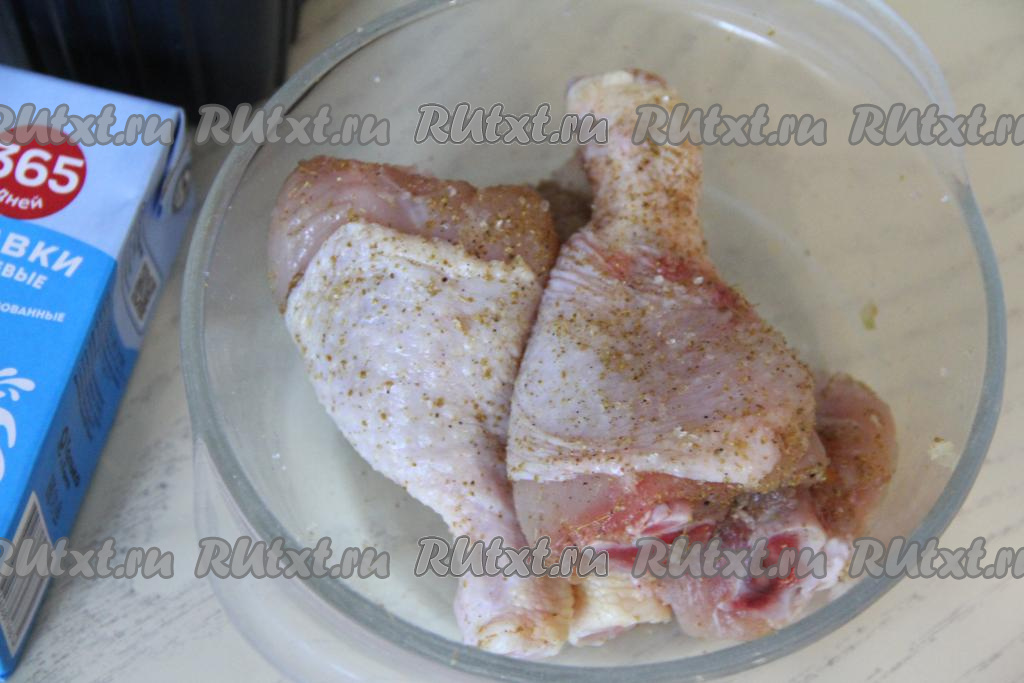 Куриные ножки посолить по вкусу, приправить специями (в качестве специй я добавила 0,5 чайной ложки карри).