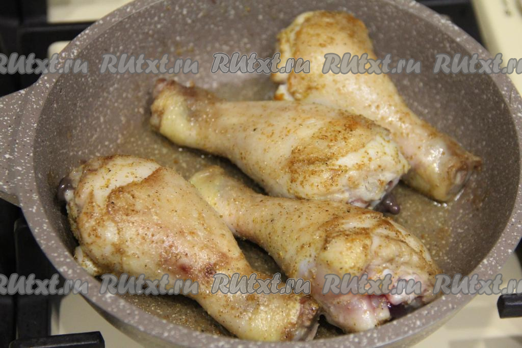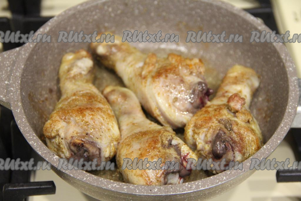 Обжарить куриные ножки на среднем огне с двух сторон до золотистой корочки (ориентировочно минут по 10 с каждой стороны).