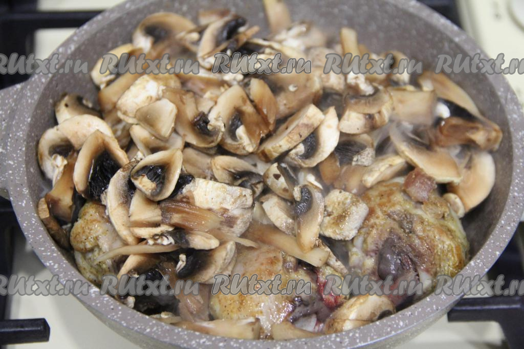 Шампиньоны нарезать на пластинки (если будете готовить с лесными грибами, тогда после отваривания крупные грибочки нужно будет нарезать на кусочки), добавить в сковороду с обжаренными куриными ножками, перемешать, убавить огонь до минимума. Накрыть сковороду крышкой.