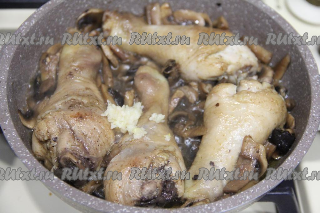 Тушить ножки с грибами, периодически перемешивая, в течение 20 минут. Затем добавить чеснок, пропущенный через пресс.