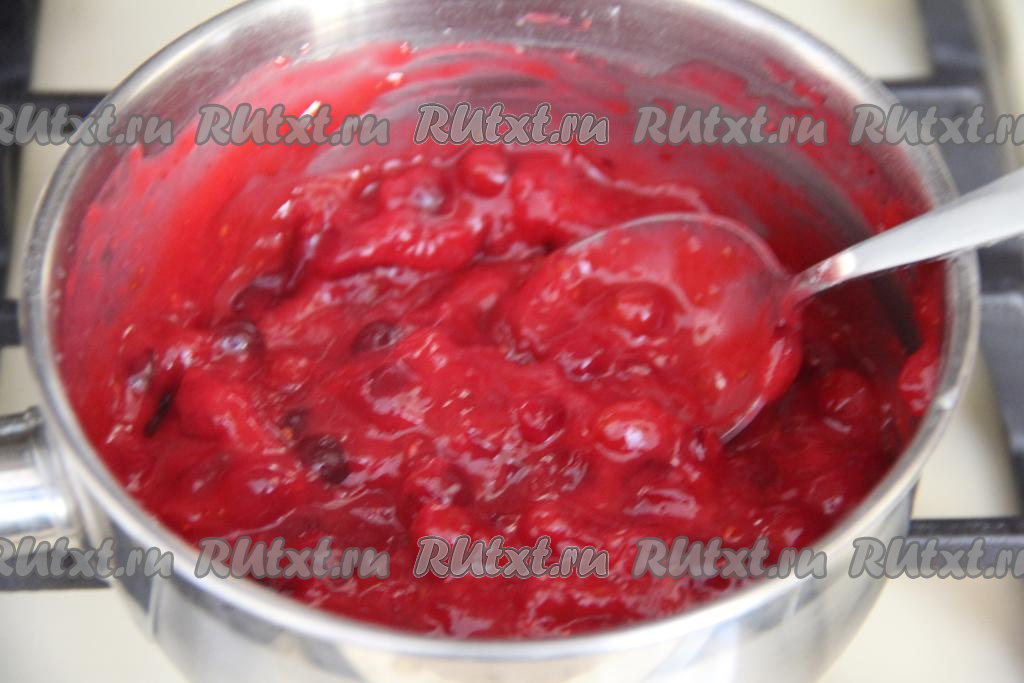 Довести начинку из клюквы, помешивая, до кипения. При закипании начинка сразу загустеет, снять с огня.