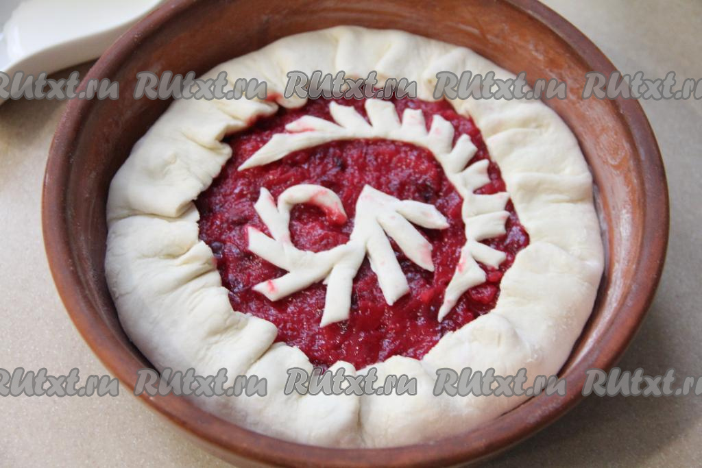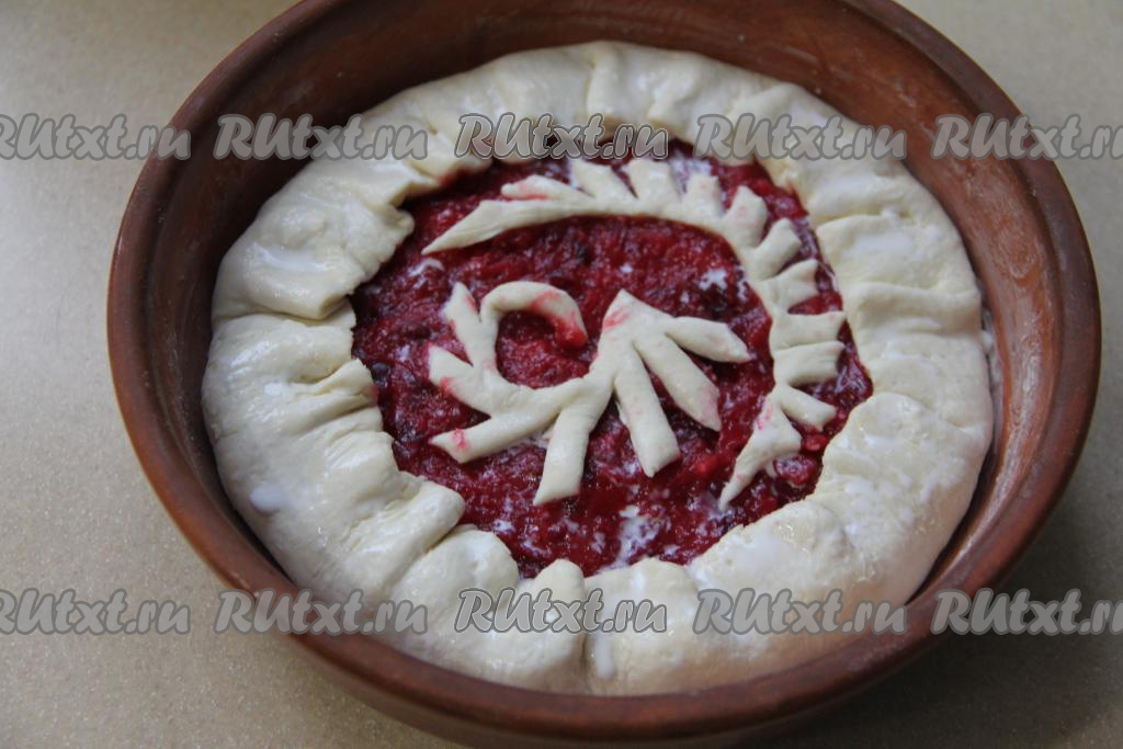 Загнуть края теста на начинку и защипать. Из оставшегося теста можно сделать узоры и выложить на пирог.