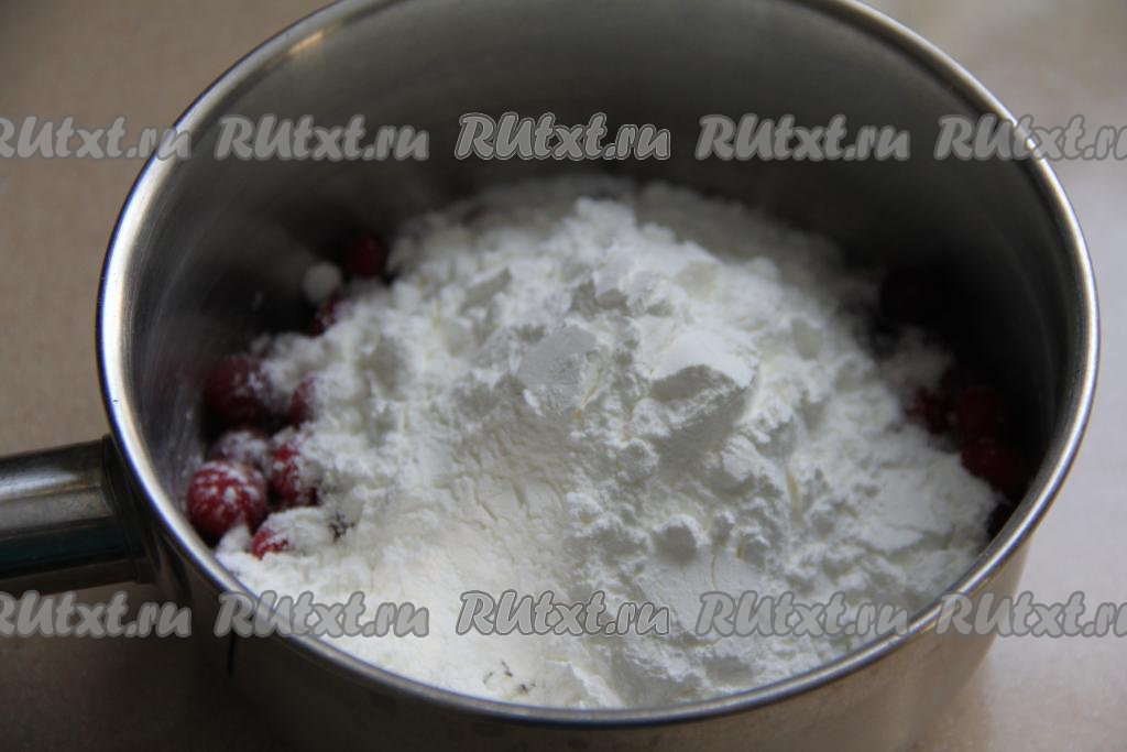 В кастрюлю всыпать клюкву, сахар и крахмал.