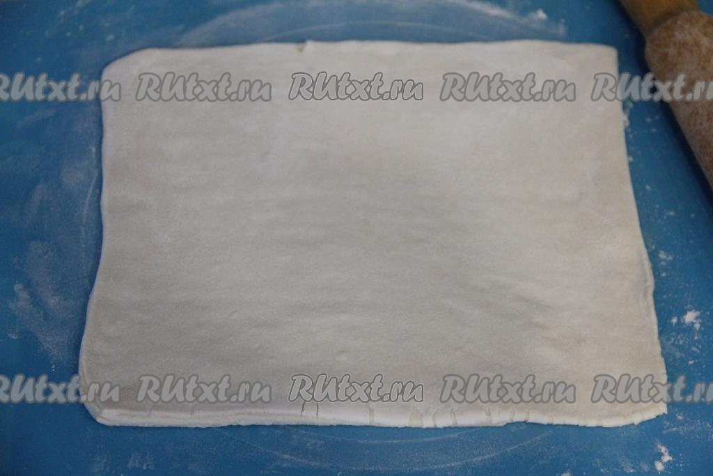 На присыпанной мукой поверхности размороженное слоёное тесто раскатать скалкой в прямоугольный пласт толщиной 3-4 миллиметра.