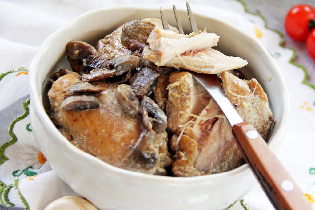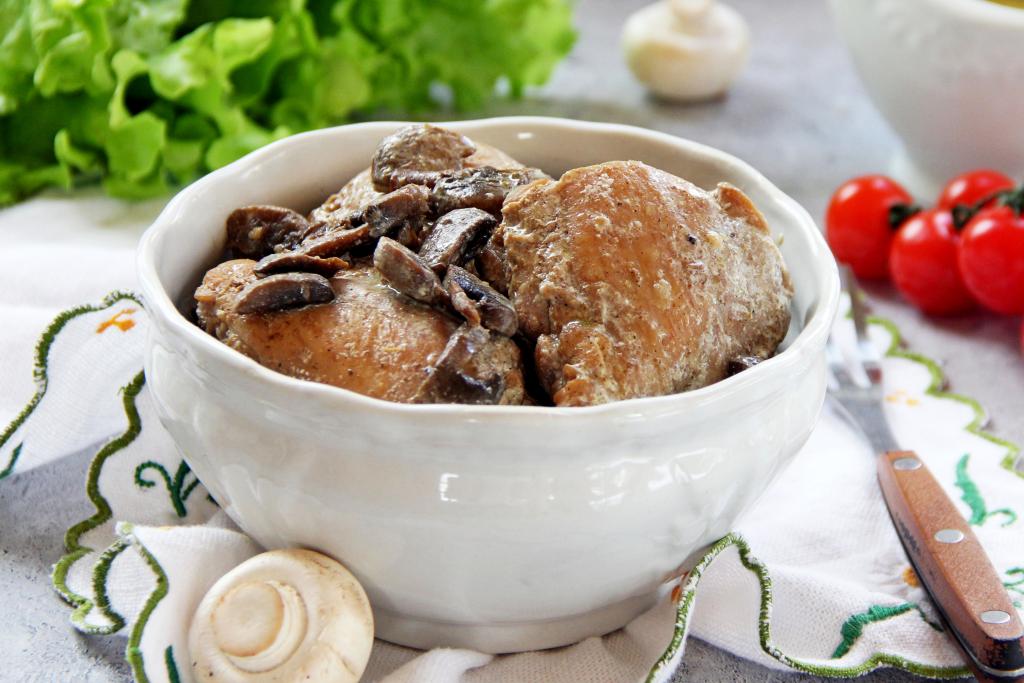 Если вы хотите к обеду или ужину подать к столу сочное, вкусное мясное блюдо, тогда приготовьте на сковороде куриные бёдра с грибами в сметанном соусе. Бёдрышки получаются очень нежными, пропаренными, ароматными. Грибочки отлично дополняют вкус куриного мяса, а сметанный соус делает блюдо более насыщенным и сочным. К столу куриные бёдра, тушёные с грибами в сметане, можно подать практически с любым гарниром (например, с картофелем, гречкой или рисом).