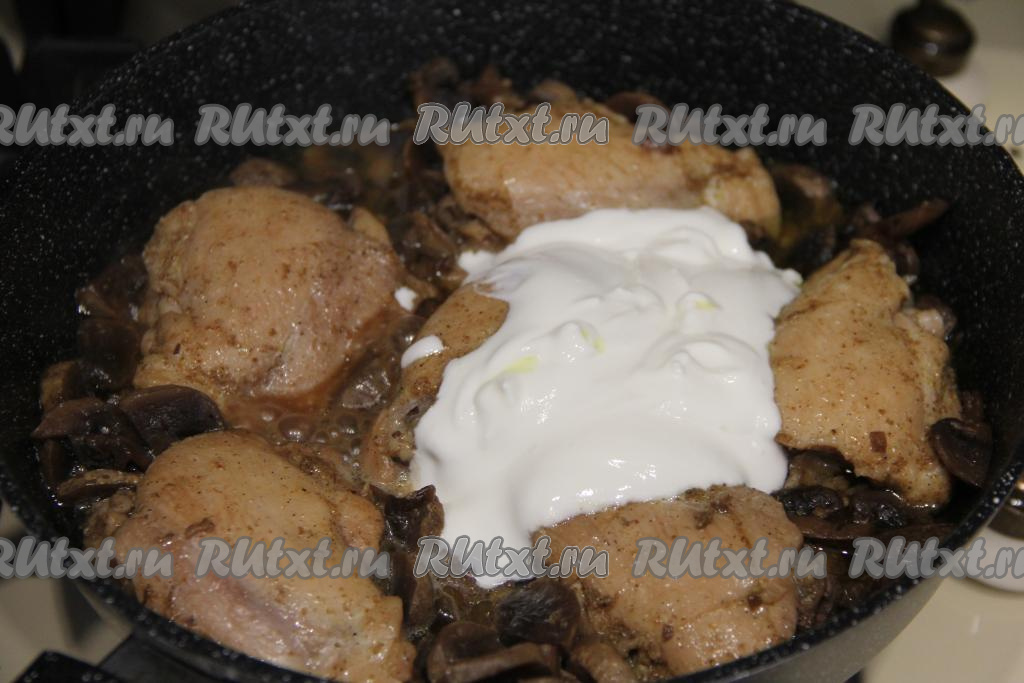 Жарить курицу с грибами в течение 20 минут на небольшом огне под крышкой, периодически перемешивая. Добавить сметану, можно немного подсолить, перемешать.