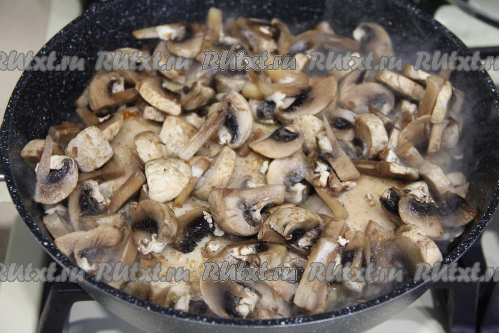 Свежие шампиньоны нарезать на пластинки. Если будете готовить с лесными грибами, тогда после отваривания крупные грибочки нужно будет нарезать на части. Подготовленные грибы выложить в сковороду с обжаренными куриными бёдрами.