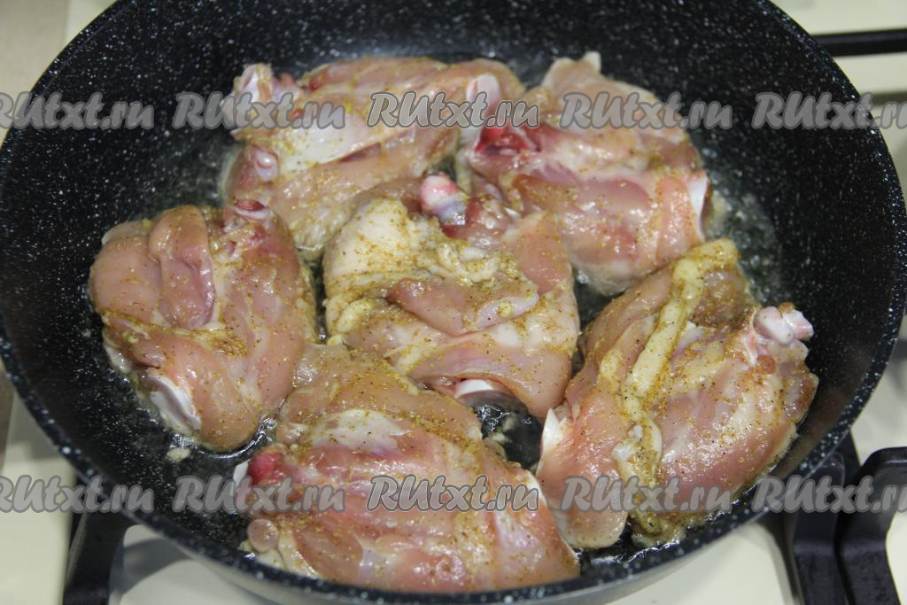 В сковороду влить растительное масло, хорошо его прогреть, после этого выложить куриные бёдра.