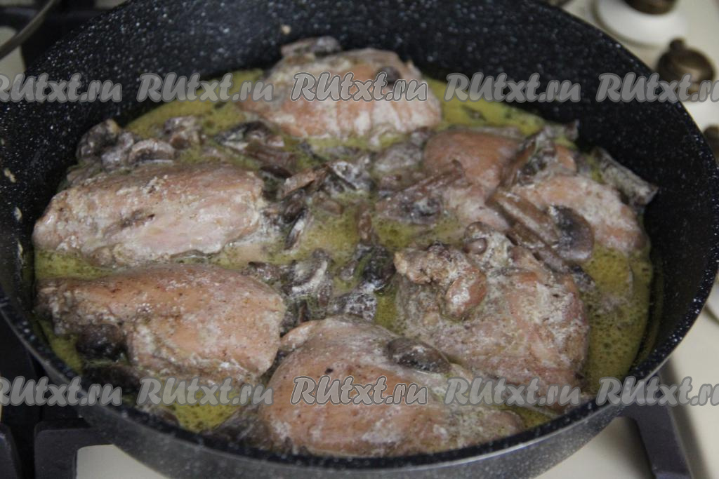 Томить кусочки курицы с грибами в сметане в течение 10 минут под крышкой на медленном огне, несколько раз за это время можно перевернуть бёдрышки.