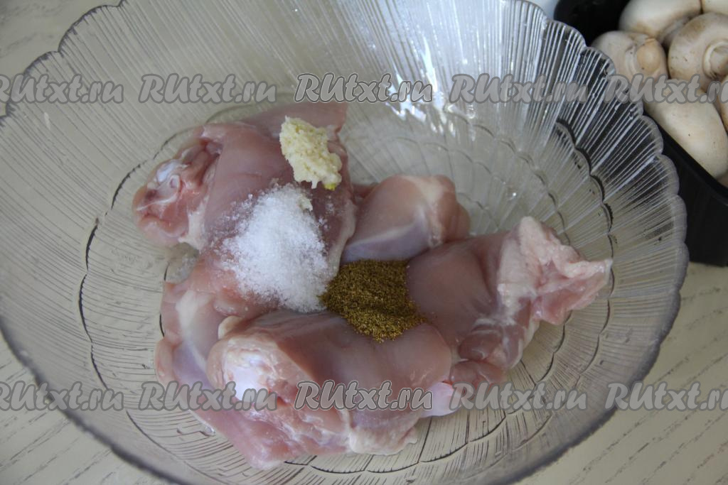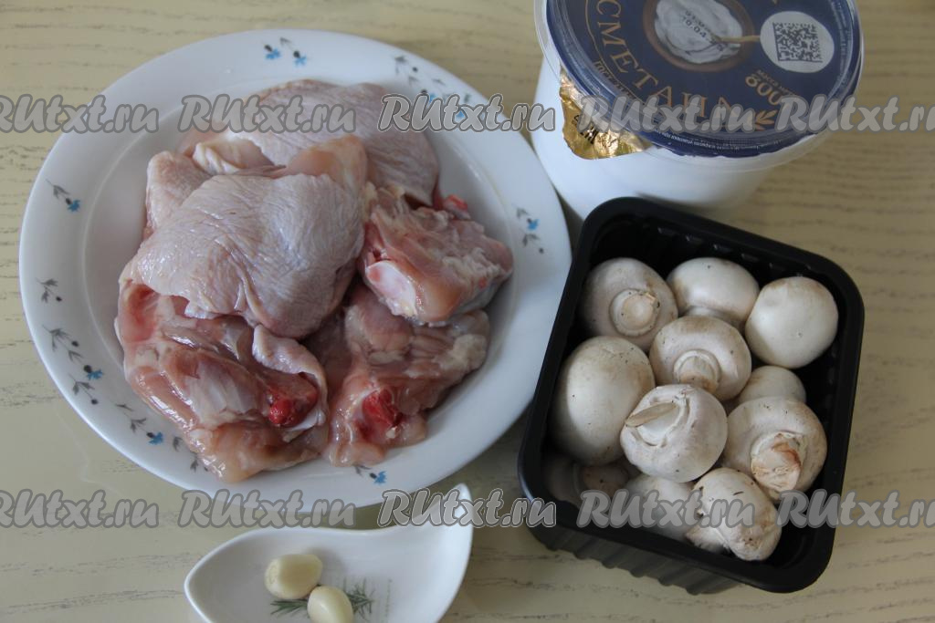 Подготовить продукты. Чеснок почистить. Куриные бёдра промыть водой, обсушить. Для этого блюда можно взять как шампиньоны (свежие или замороженные), так и предварительно отваренные в течение 25-30 минут лесные грибы. Замороженные грибы размораживать не нужно. Свежие шампиньоны нужно будет промыть водой, убирая с них все загрязнения.