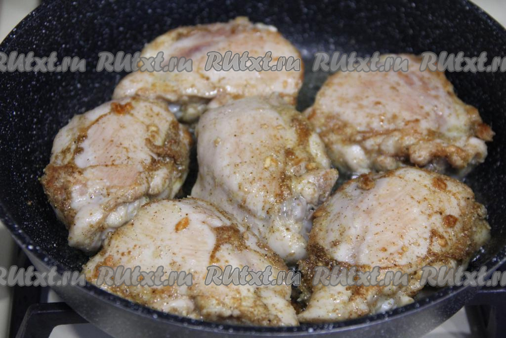 На среднем огне обжарить бёдрышки до золотистого цвета с двух сторон (примерно по 10 минут с каждой стороны).