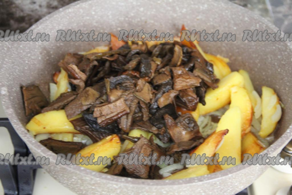 После того как картошка с луком и чесноком обжарится в течение 5-7 минут, добавить в сковороду отваренные сушёные грибы.