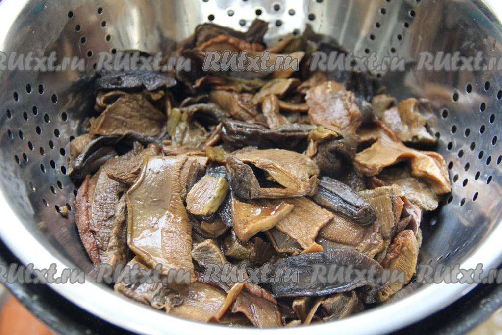 Отваренные грибы откинуть на дуршлаг, дать лишней жидкости стечь.