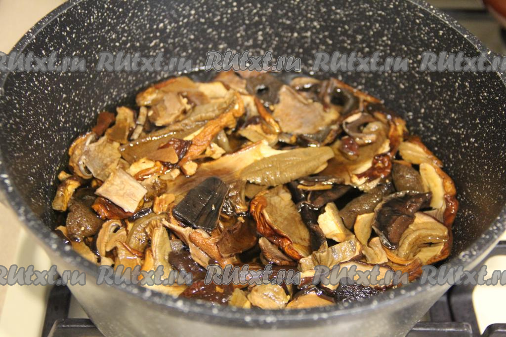 Заранее сушёные грибы (у меня - белые) хорошо промыть водой. Затем переложить промытые сушёные грибы в миску, залить полностью холодной водой и оставить на 1-4 часа. Далее слить воду, переложить грибы в кастрюлю, залить полностью свежей водой, поставить на огонь. После закипания воды варить грибы на небольшом огне 20 минут.