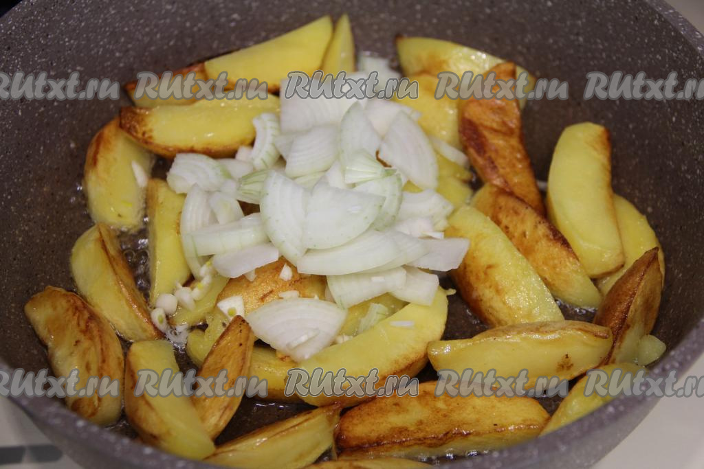 Жарить картошку до золотистой корочки и полуготовности, иногда переворачивая. Затем добавить в сковороду лук, нарезанный на полукольца (или четверть кольца), и мелко нарезанный чеснок, перемешать. Обжарить картошку с луком в течение 5-7 минут, изредка перемешивая.