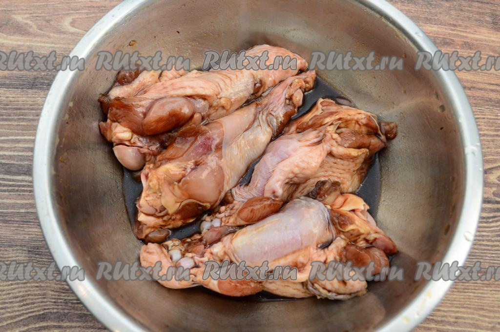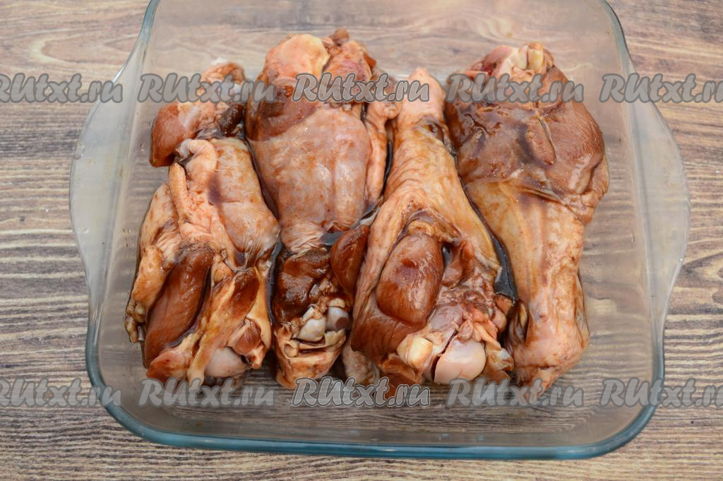 В форму для запекания выложить плечи индейки в один слой. Залить их оставшимся соусом, в котором мариновалась индейка. Отправить форму в разогретую до 180 градусов духовку на 30 минут.