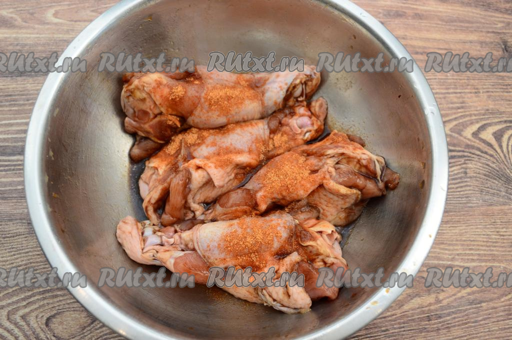 Затем всыпать к индейке специи для птицы. Тщательно перемешать, покрывая мясо специями со всех сторон.