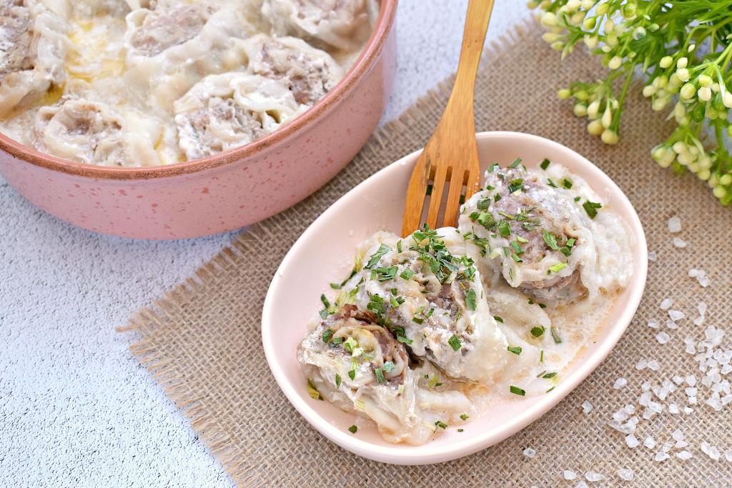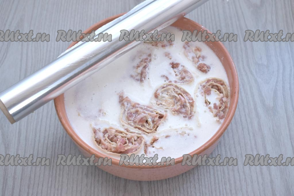 В отдельной ёмкости смешиваем сметану и 400 миллилитров воды комнатной температуры, солим, приправляем специями (я всыпала немного чёрного молотого перца), тщательно перемешиваем получившийся сметанный соус. Вливаем соус из сметану в форму с ленивыми пельменями. Соус должен практически полностью покрыть рулетики из лаваша. Форму накрываем фольгой.