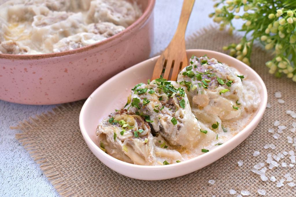 Достаём форму с готовым блюдом из духовки. Сочные, вкусные, нежные ленивые пельмени из лаваша вместе со сметанным соусом раскладываем по тарелкам и в горячем виде подаём к столу, посыпав, по желанию, зеленью.