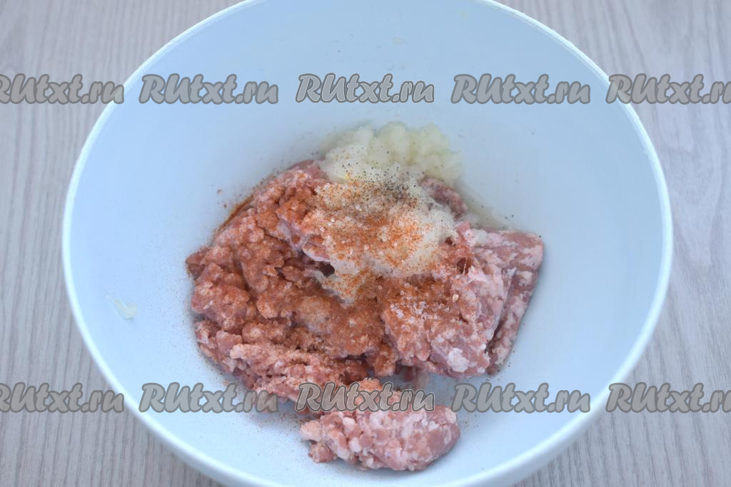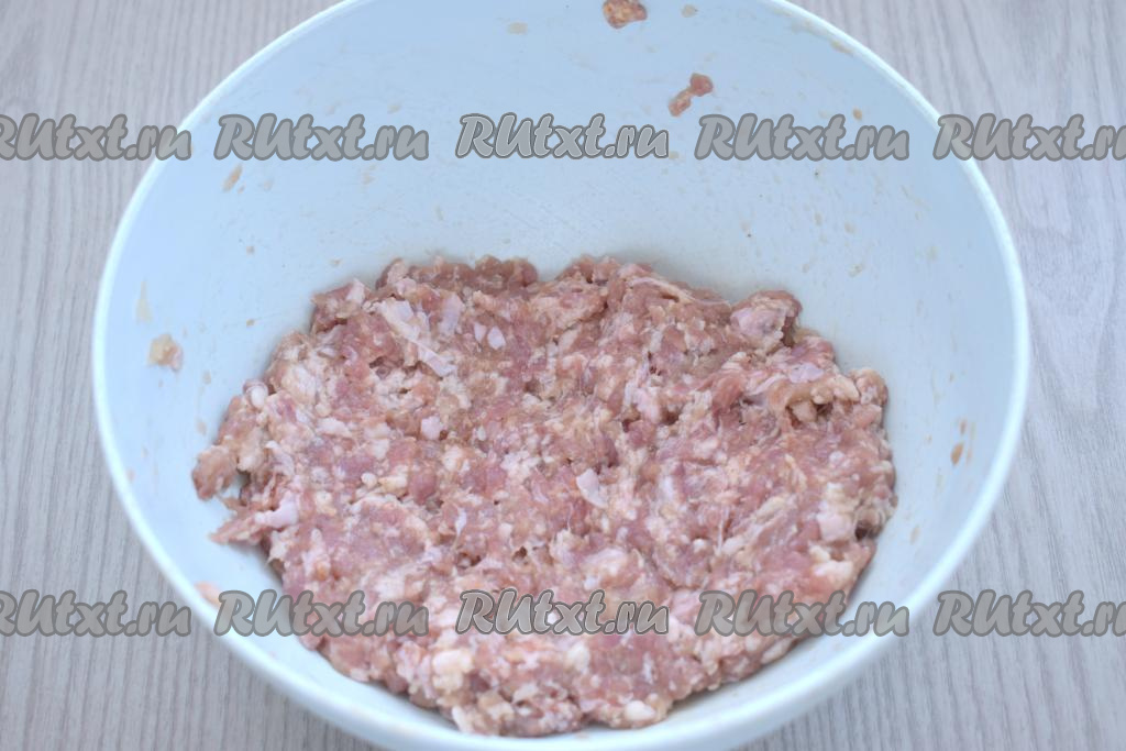 Тщательно перемешиваем фарш. Для того чтобы фарш был неплотным, добавляем в него примерно 40 миллилитров воды, перемешиваем.
