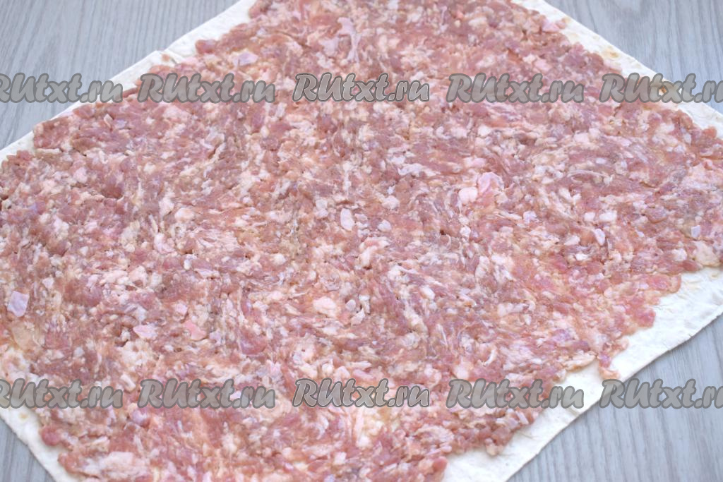 Расстилаем на столе тонкий лист лаваша. У меня лаваш размером 35 сантиметров на 29 сантиметров. Выкладываем на лист лаваша фарш и, оставляя по 1 сантиметру от краёв лаваша чистыми, равномерно распределяем фарш по лавашу.