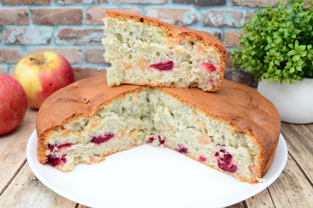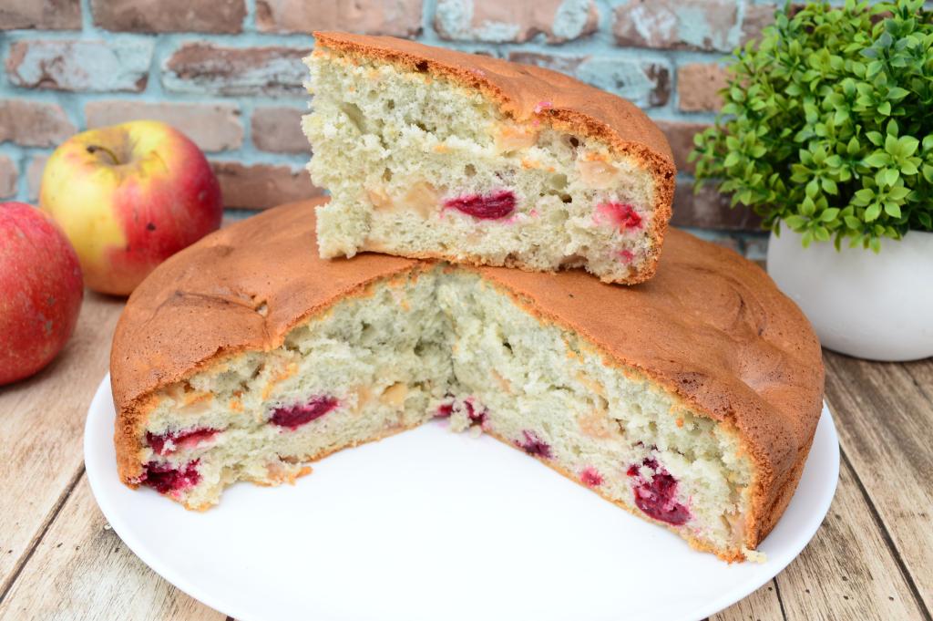 А вот как шарлотка с вишней и яблоками выглядит в разрезе, у неё пористый мякиш с сочными вкраплениями кусочков яблок и вишни. Очень вкусно!