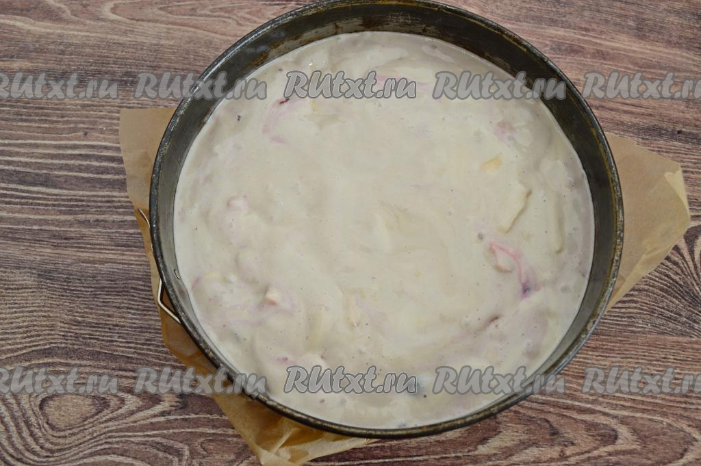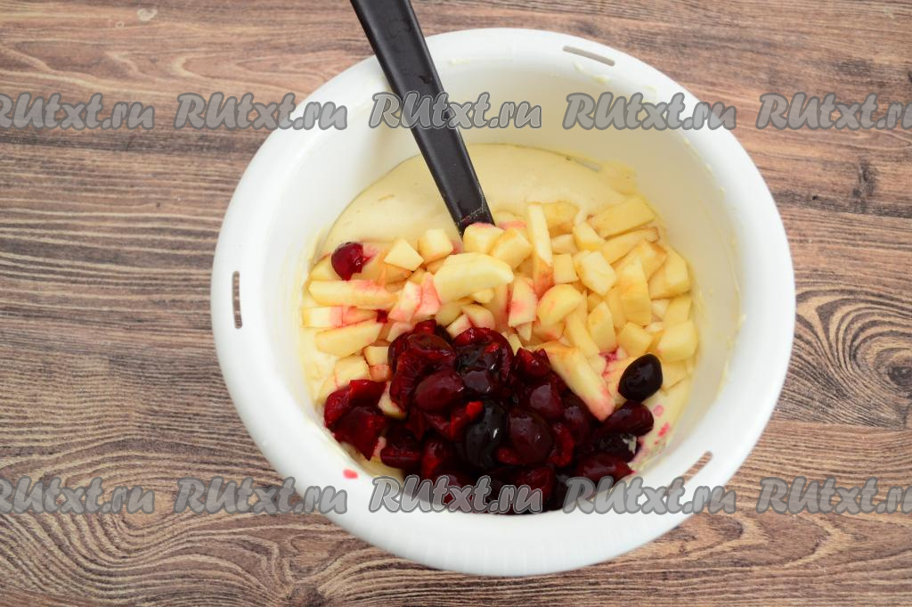 Добавить в тесто кусочки яблок и подготовленную вишню (у меня ягоды вишни были крупными, поэтому перед добавлением в тесто я каждую ягодку разрезала пополам).
