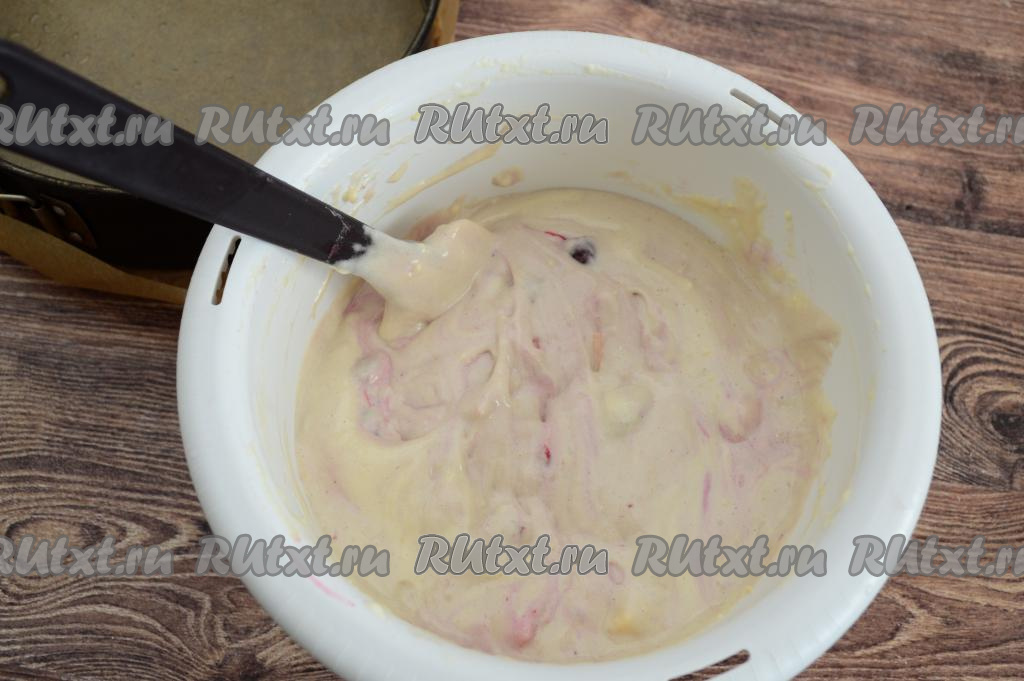 Аккуратно вмешать ягоды и яблоки с помощью лопатки в тесто, равномерно распределяя по всему тесту.
