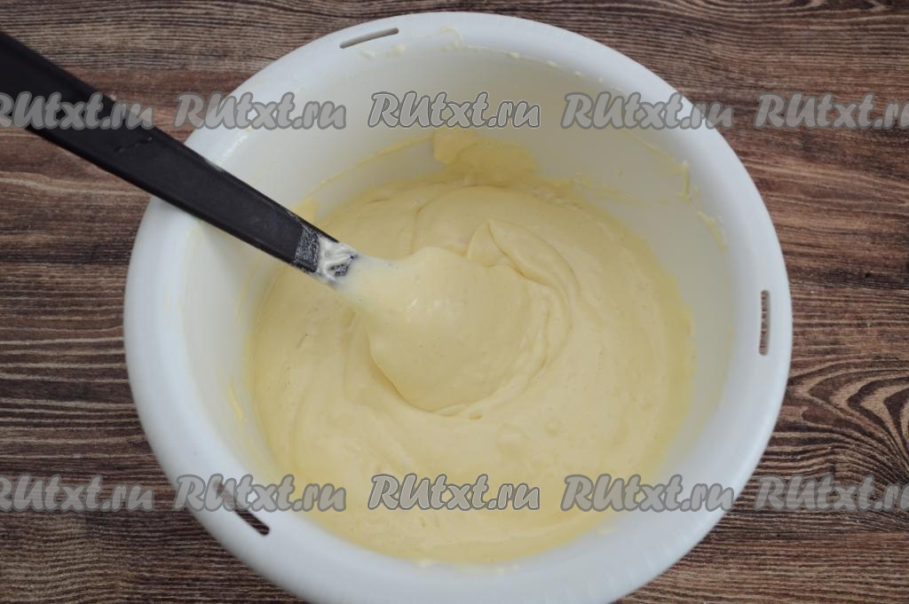 При помощи лопатки вмешать муку в тесто, стараясь не сбить воздушность взбитых яиц. Небольшими порциями добавляя оставшуюся муку и каждый раз полностью вмешивая её, замесить тесто для шарлотки, которое должно получиться однородным, напоминающим сметану средней жирности, оно будет широкой лентой стекать с лопатки.